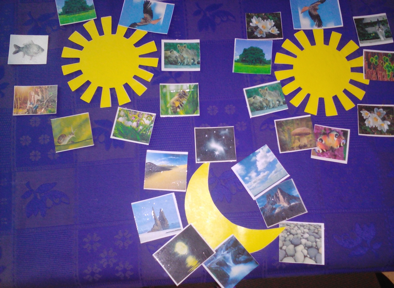Матеріал: предметні картинки із зображенням предметів живої та неживої природи, сонечко, місяць.
