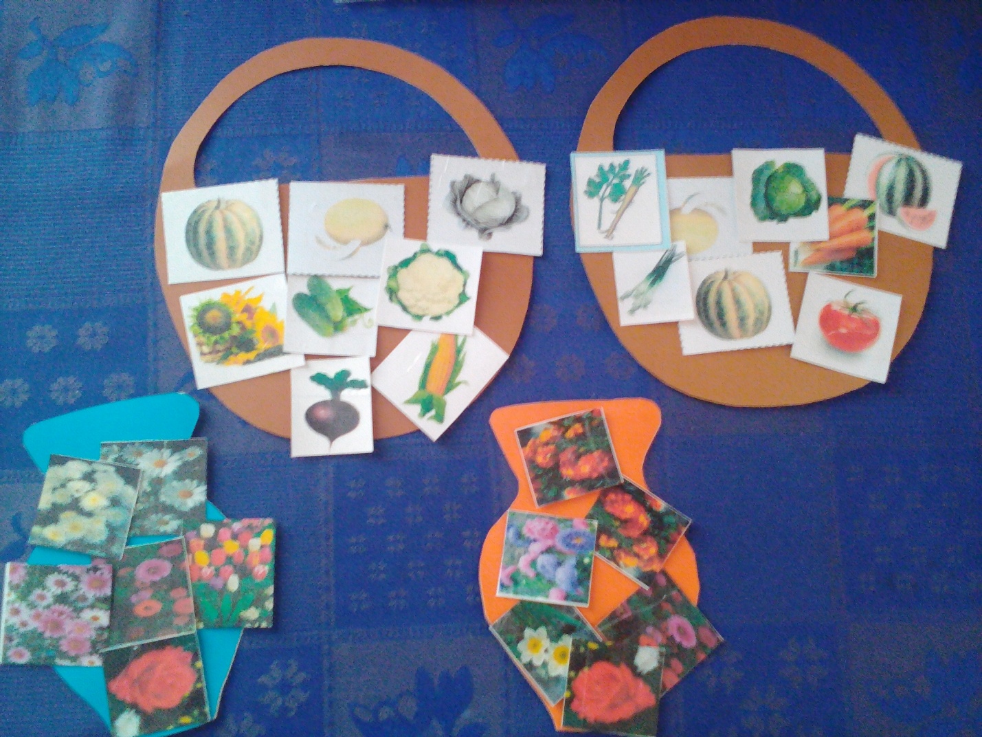 Матеріал: предметні картинки овочів та квітів квітника, ваза, кошик,